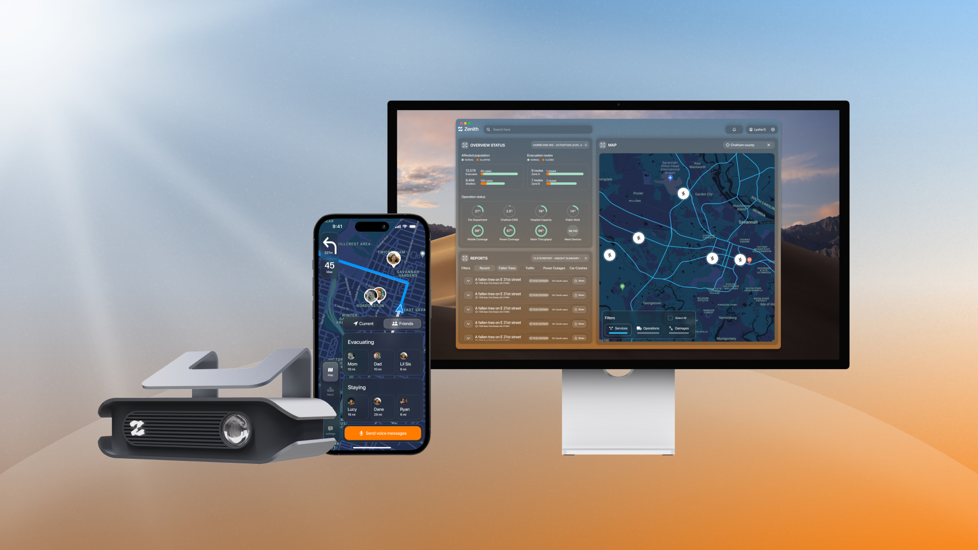 It enables long-range communication and extended battery life. Integrated into Zenith Go, it forms a distributed network of devices ensuring continuous connectivity throughout the Zenith Ecosystem for emergency operations.