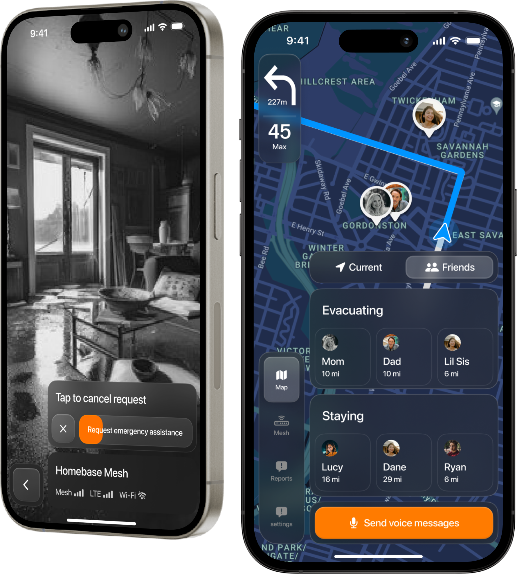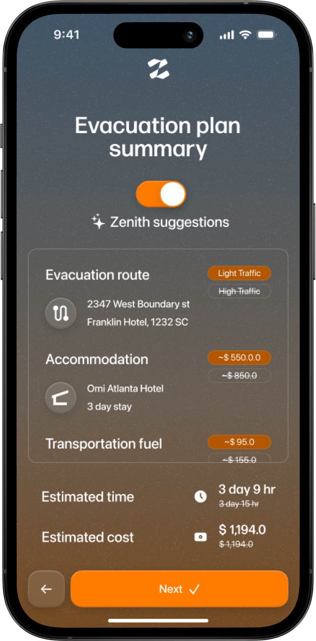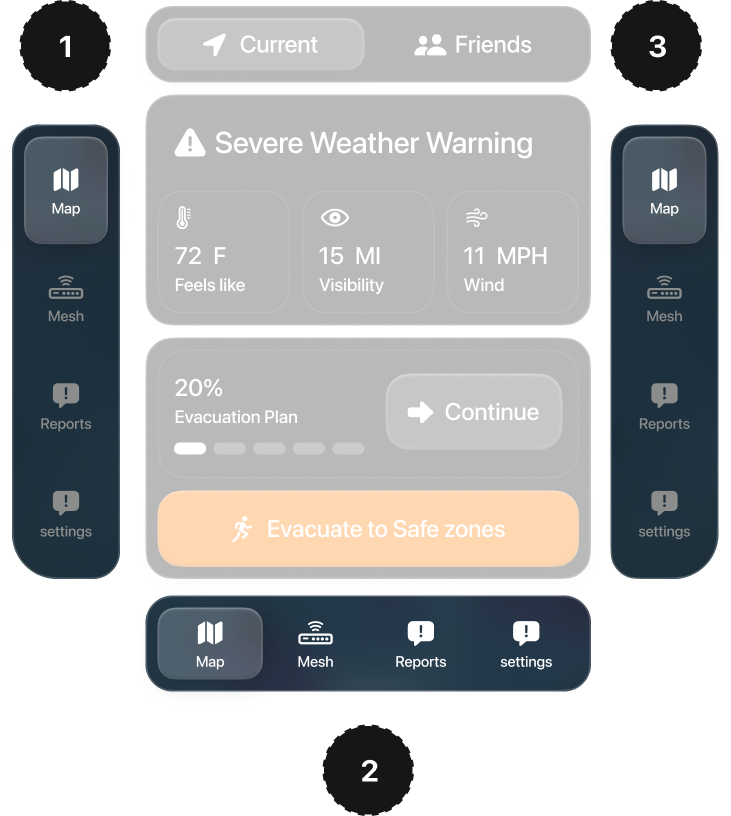 Our public-facing mobile application is optimized for evacuation travel, assisting users in planning and navigating during emergencies while also allowing them to remotely monitor their houses.
